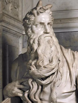 Michelangelo’s famous sculpture of Moses depicts the misunderstanding of the Hebrew word for horn. Note the two horns on the head of Moses in the photo above. The photo on the right is probably more correct in describing how Moses looked after spending many days in the presence of God.